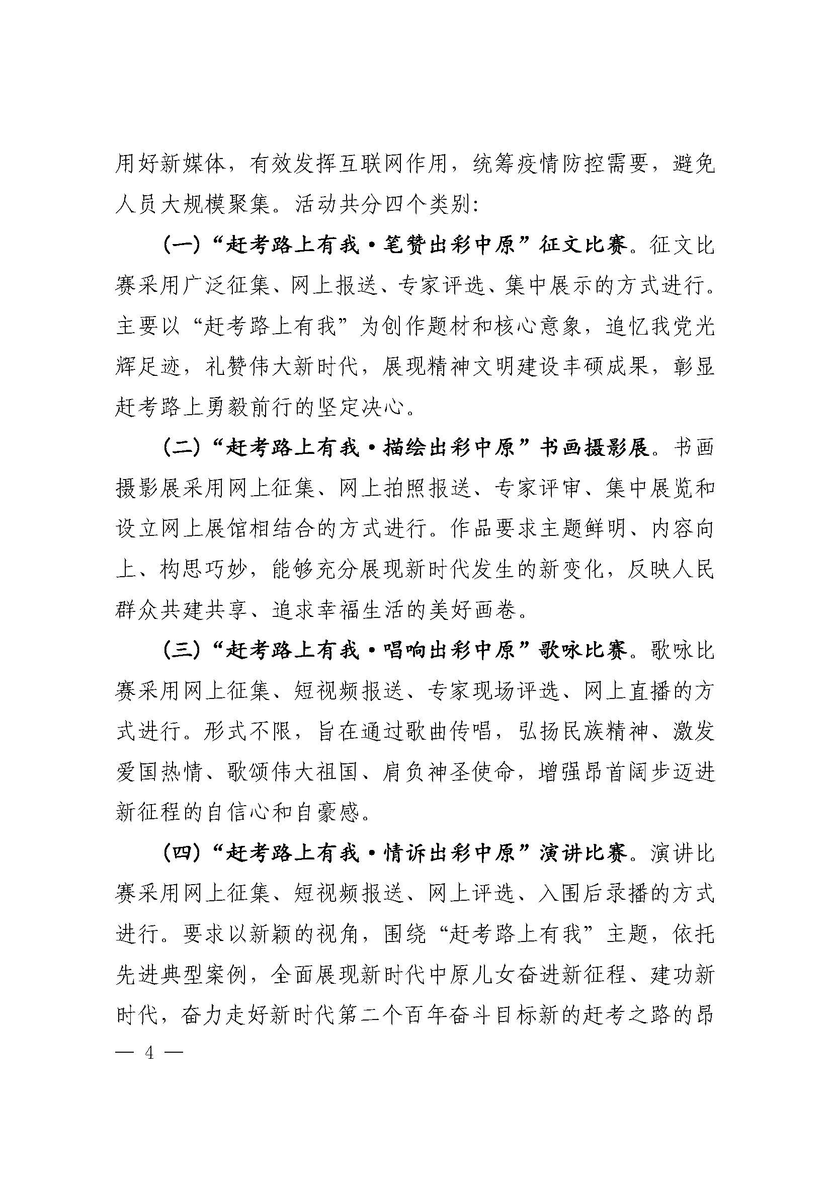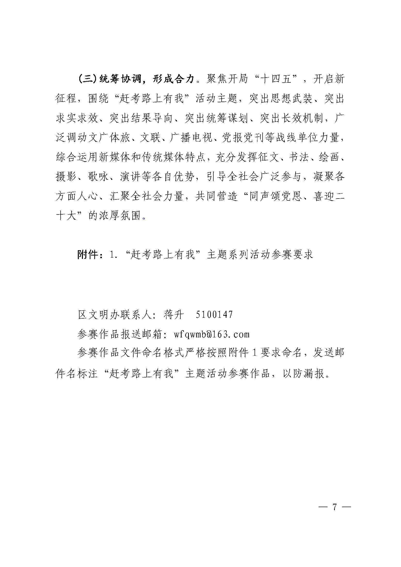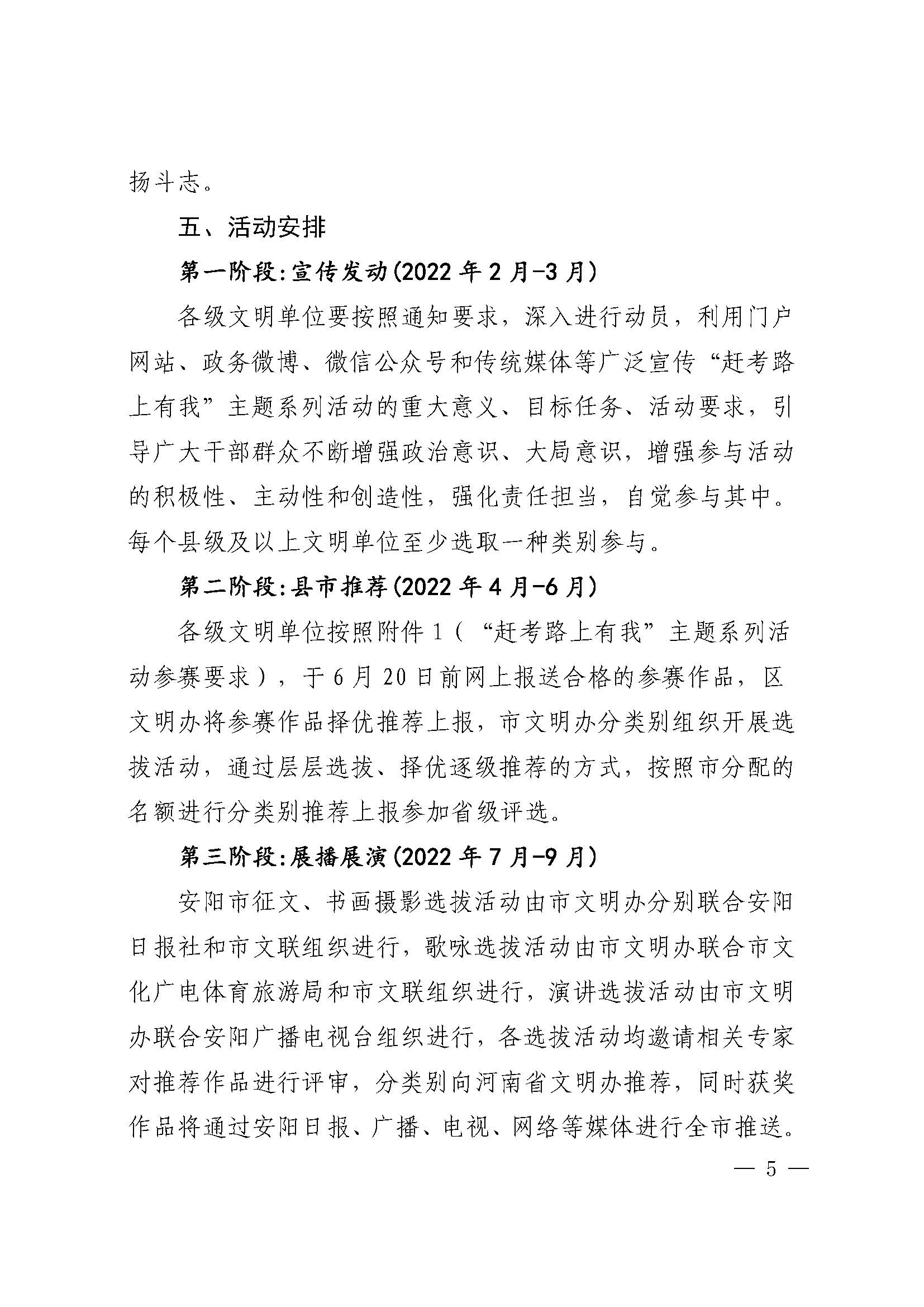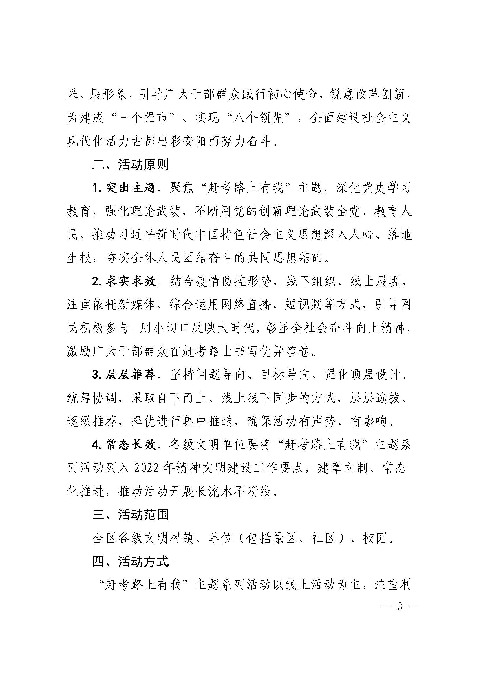 根据省、市文明办活动安排,在我市将开展“赶考路上有我”主题系列活动。因疫情防控需要,参赛作品采用网上征集方式。参赛活动分为征文、书画、摄影、歌咏、演讲5类,通知附件1中列出详细参赛作品要求,请大家认真阅读,报送合格参赛作品。报送电子作品(严格按照附件1文件命名格式要求命名),请于6月10日前将参赛作品邮件发送至局办公室邮箱(ayswwjbgs@163.com),发送邮件名标注“赶考路上有我”主题活动参赛作品,以防漏报。有问题可以联系区文明办联系人:蒋升5100147 。